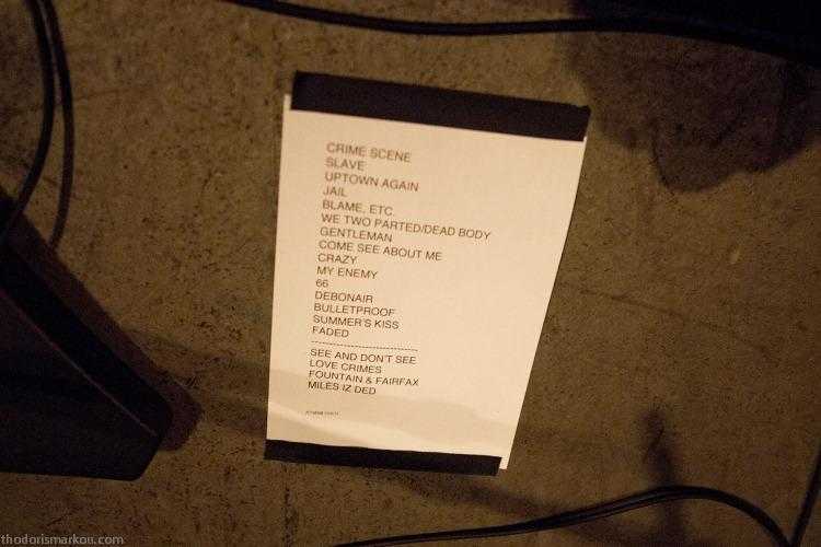 Ξεκινήσανε με το επιβλητικό, εξομολογητικό «Crime Scene, Part One» λουσμένοι στα μπλε φώτα και με την πρώτη υγρασία του ιδρώτα να γυαλίζει στο μέτωπο του τραγουδιστή. Ακολούθησε το πιθανότατα αυτοβιογραφικό «I‘m Her Slave», ύστερα το «Uptown Again», που μοιάζει τόσο πολύ στιχουργικά με το προηγούμενο. Αλλά μήπως δεν τις ξέρουμε τις εμμονές του δημιουργού αυτών των σκληρών ερωτικών σεναρίων;
