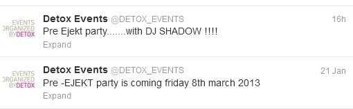 Όπως μπορείτε να δείτε στο χθεσινοβραδινό tweet της Detox, στις 8 Μαρτίου 2013 θα γίνει ένα party για το EJEKT Festival. Σ' αυτό το party θα παίξει ο DJ Shadow!!!