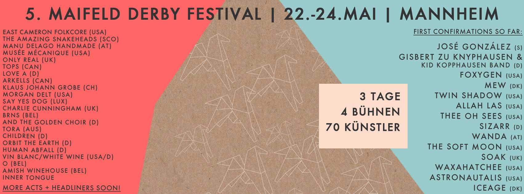 Πέρασαν σχεδόν δύο μήνες από τις πρώτες ανακοινώσεις ονομάτων για το Maifeld Derby 2015. Αυτή την εβδομάδα οι διοργανωτές του γερμανικού φεστιβάλ που σας συστήσαμε πέρσι έδωσαν στη δημοσιότητα το δεύτερο μεγάλο πακέτο με τους καλλιτέχνες και τα συγκροτήματα που θα φιλοξενηθούν στον ιππικό όμιλο του Μάνχαϊμ το τριήμερο 22-24 Μαΐου 2015 στην πέμπτη έκδοση του Maifeld Derby.